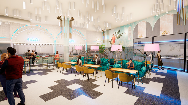 Además de los puestos de comida, el complejo incluye cafetería, heladería, locales de copas y un área de food trucks.